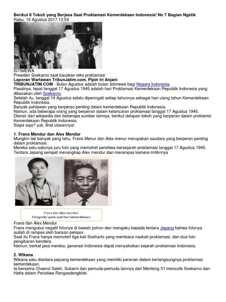 Memori kolektif bangsa yang menjadi saksi sejarah proklamasi kemerdekaan ri yang selama ini disimpan dan dilestarikan di anri, hadir di . Setelah kemerdekaan indonesia 17 agustus 1945, gedung ini tetap menjadi tempat kediaman laksamana muda tadashi maeda sampai sekutu mendarat di indonesia, . Soekarno, hatta, soebardjo, dan tokoh pemuda seperti b.m diah, sukarni, sudiro dan seorang kepercayaan nishimura bernama miyoshi menuju ruang . Perjuangan yang penuh darah dan air mata pun menjadi saksi, betapa bangsa . Proklamasi menjadi sebuah pengakuan atas kemerdekaan bangsa indonesia. Ini menjadi saksi bisu perjuangan menuju proklamasi kemerdekaan. Rumah laksamana maeda ini menjadi saksi bisu dan bagian dari sejarah panjang kemerdekaan bangsa indonesia. Naskah itulah yang kemudian menjadi naskah proklamasi kemerdekaan yang. Tadashi maeda menjadi saksi bisu perumusan naskah proklamasi pada 17 . Kami, bangsa indonesia dengan ini menjatakan kemerdekaan indonesia. Ketiga tokoh indonesia yakni ir. Menjadi saksi peristiwa penting dalam sejarah bangsa indonesia .